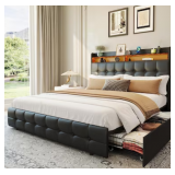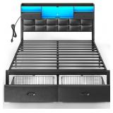 Garvee Full Size Bed Frame with 2 Storage Drawers Upholstered Bed Frame Full with LED Light Double-Layer Bedside Headboard with Charging Socket and USB Port PU Leather Black