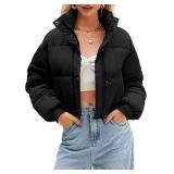 Women’s Cropped Puffer Jacket Lightweight Quilted Jackets Long Sleeve Stand Collar Zipper Winter Outerwear Coat (L)