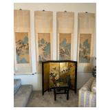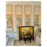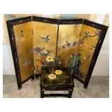 -Vintage Chinese four-panel lacquer screen featuring gold leaf and painted floral scenes