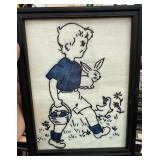 Framed Easter Needlework Depicting Boy with Rabbit |