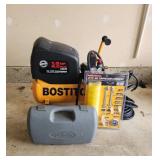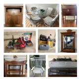 This is a combo auction of two households. Some of the highlights include Blenko bookends, secretary desk, Bostitch air compressor, vintage knee huggers, air hockey table, tools, sewing machine, electronics and more.