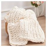 Chunky Knit Throw Blanket, 50''*60'' Knitted Throw Chenille Yarn for Bed Couch, Handmade Cream Crochet Big Thick Blanket, Machine Washable Cute Comfy Blanket for Home Decor