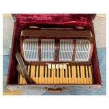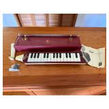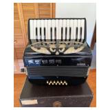 Yamaha guitar CG122MSH, Melobar electric lap guitar, Antique “frying pan” steel lap guitar with case, Scandalli accordion, Verona accordion, Hohner Melodica Piano 27, Yamaha THR10C modeling amplifier, Carvin powered mixer SP600, Alesis Studio 32 mixing console, Seth Thomas metronome with conductor’s wand |