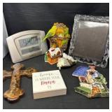 Lot #98 Mixed Home Decor Lot: Crosses, Frames, Night Lights, Wall Art, Bird Figurines, Clock
