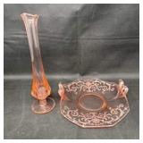 Lot #29 Vintage Pink Depression Glass Bud Vase and Etched Plate Set