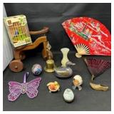 Lot #38 Mixed Vintage Decor Lot, Cloisonn項ggs, Brass Bell, Alabaster, Asian Fans, Trinket Boxes & More