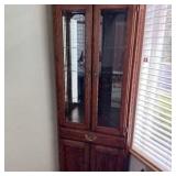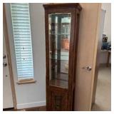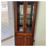 Lot #43 Vintage Oak Lighted Corner Curio Cabinet #1, Glass Display Case, 75.5" Tall