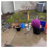Lot #209 - Garden Decor and Yard Tools Lot with Planters, Stakes, and Ornaments