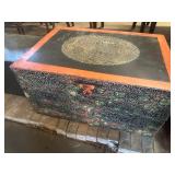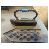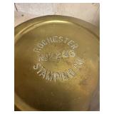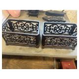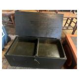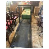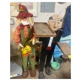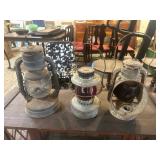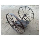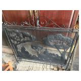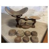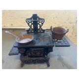 WOOD & METAL ANTIQUE COLLECTIBLES* Cast Iron Salesman Sample Wood Stove, Cast Iron Sausage Stuffer, Cast Iron Balance Scale, 2 Large Platform Scales, Pair of Iron Wheels, Cast Iron Fire Place Mantel, Nice Heavy Fireplace screen, Small Fireplace Screen, Pair of Andirons, Fireplace Tools, Large Sad Iron & Trivet, Grinding Stone Wheel Stand, Primitive Wood Trunk, Round Wood Cheese Cutting Block, Large Primitive Boot Jack, Large Brass Planter, 3 Vintage Railroad Lanterns (Red Lense), Bellows, 2 Scrub Boards, Galvanized Hog Water Trough, 2 Wood Ferkin Sewing Buckets, Pewter Dish Sets,