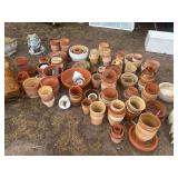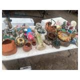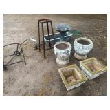 GLASS & POTTERY* Depression Glass, Jadeite Bowls, Roseville Bowls, Punch Bowl, China Sets, Cut Glass, Wine Glasses, Stem Ware, Collector Plates, Salt & Pepper Shakers, Several Vases, Numerous Clay Flowerpots, 2 Pairs Cement Planters, Garden Figurines, Arch Window, & More!