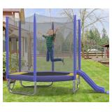 7FT Trampoline + Safety Enclosure Net+Slide + Ladder, Easy Assembly ,Regular Hexagon This vibrant trampoline with safety net is a perfect addition to any backyard, offering endless fun for kids; They can jump, roll, and slide down with joy, while parents enjoy peace of mind thanks to its sturdy construction and UV-protected safety features; Ideal for outdoor family activities, it's built to last and withstand all weather conditions, ensuring a safe and exciting play area for children to release their energy; Dimension & Weight Dimensions (Overall): 79''(H)×115''(W)×84''(D) Trampoline Diameter: 84'' Jumping Area Length: 76'' Jumping Area Width: 76'' Net Pole Height: 63;6'' Mat Height : 15;84'' Max User Weight: 220 lbs Recommended Capacity: 1-2 people Total Product Weight(G;W): 74;74 lbs Specification Shape Regular Hexagon Pad Color Purple,Black Number of Safety Poles 6 Number of Support Legs 3 Spring Count 36 Number of Entrances 2 Additional Informaiton Type Backyard: Above Ground Location Outdoor Use Age Group 3+ Years UV Resistant UV Resistant Net Inner/Outer Enclosure Outer enclosure Zipper Closure Yes Padded Safety Poles Yes Safety Pad Included Yes Pad Material PVC Spring Material Galvanized Steel Frame Material Steel Jump Surface Material Polypropylene Additional configuration Slide ; Ladder; Soft Pad Rust Resistant Yes Weather Resistant Yes Country of Origin China Level of Assembly Full Assembly Needed Adult Assembly Required Yes Product Warranty Yes