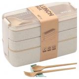 *5 PACK* Beige Stackable Bento Lunch Box Kit, 3-In-1 Compartment Wheat Straw Lunch Containers with Tableware, Reusable On-the-Go Meal and Snack Containers