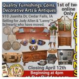 1st of two online only auctions for Jane Allen and "Lanny" Schwartz who have moved. Located in the beautiful Lake View neighborhood in Cedar Falls. Selling to the highest bidder is a small but fine offering of quality furnishings both vintage, antique & modern, Gold and silver coins, gold rings, and decorative art and collectibles.