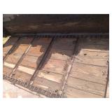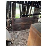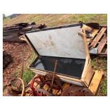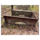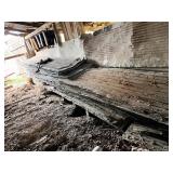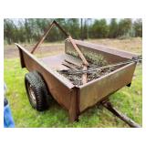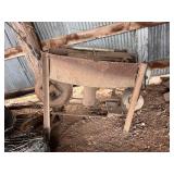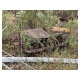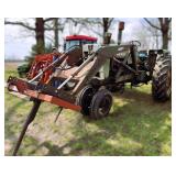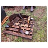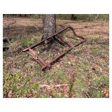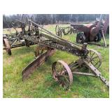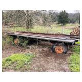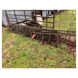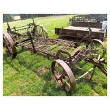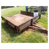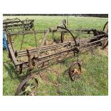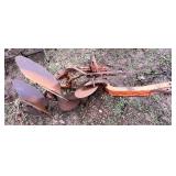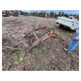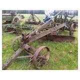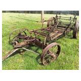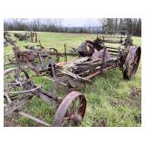 3 – hay wagon frames, Allis Chalmers two-bottom plow & loader, antique truck bed trailer,