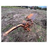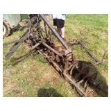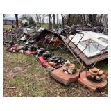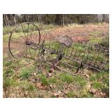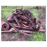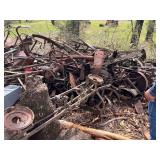 Allis-Chalmers (WD?) tractor (parts), 2 – horse drawn side delivery rakes, 2 – classic front tine tillers,