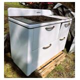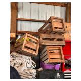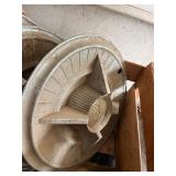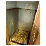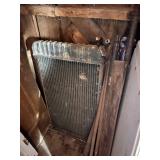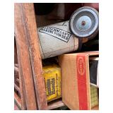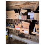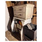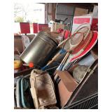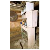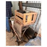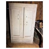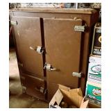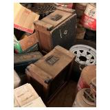 antique wardrobe, John Deere corn sheller, Antique metal ice box, wooden boxes, kerosene heater,