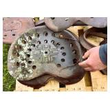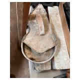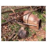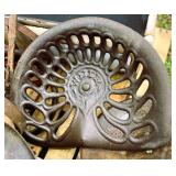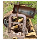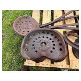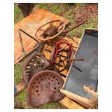 Large Erie pipe clamp, cast iron implement seat, lot press metal implement seats, platform scales,
