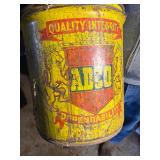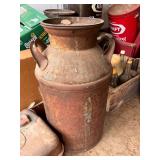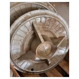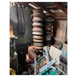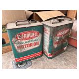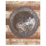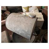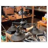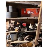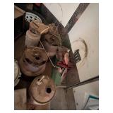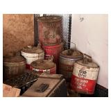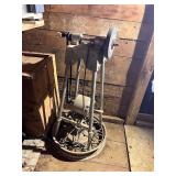 lg lot metal fuel cans w/graphics, buzz saw blades, Riveters forge w/misc. tongs,