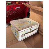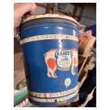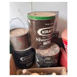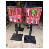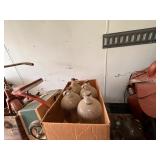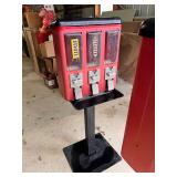 3 – three head gumball machines on pedestals, Primitive wood box, lard bucket, enamel yard lamps,
