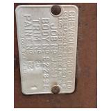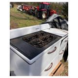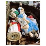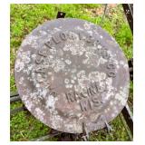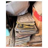 lot old license plates, vintage “New Perfection” gas stove, nativity blow mold set, buzz saw mandrel,