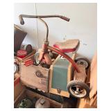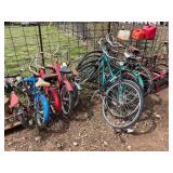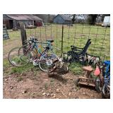 lg lot misc. old tins & cans, old cast iron stove, lot old bicycles,