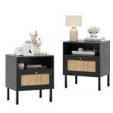 Aimara Rattan Nightstand Set 2, Bedside Table with Open Shelf and Door, Boho End Table (Set of 2)