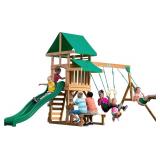 ***INCOMPLETE*** Backyard Discovery Belmont Cedar Wood Swing Set with Wave Slide, Play Deck, Rock Wall Ladder, Snack Bar Window, Shaded Picnic Area, Bench, Belt Swings, Trapeze, Sandbox Area, Canopy, Outdoor Playset