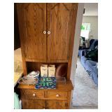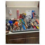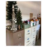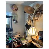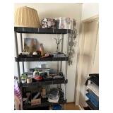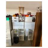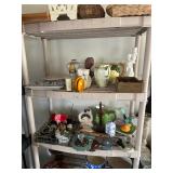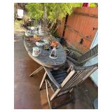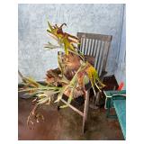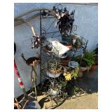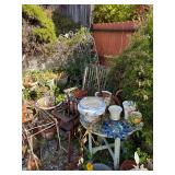 Antique “teak” patio table w/ 4 chairs, plants, gardening supplies, tools and other hardware, filing cabinets, some artworks, utility cabinet (oak), some old wrought iron and wood pieces, beautiful mid-century sewing machine.