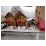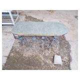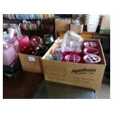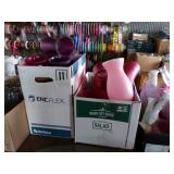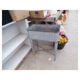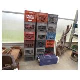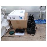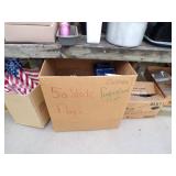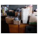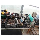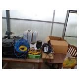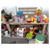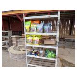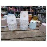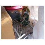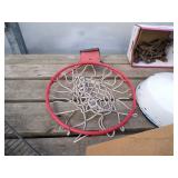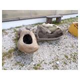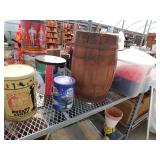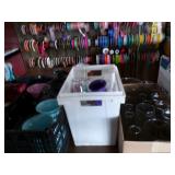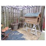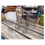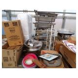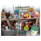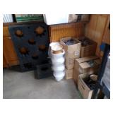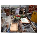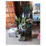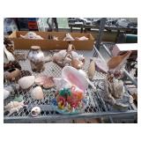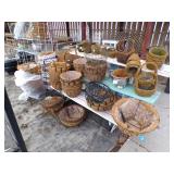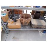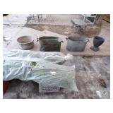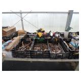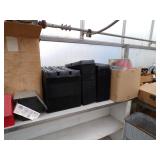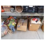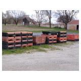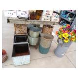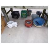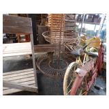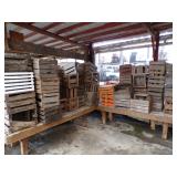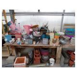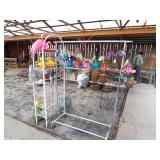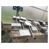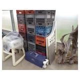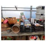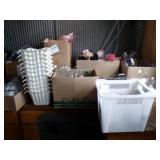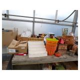 8 - Motorola 2 way radios with base station, 36 plastic milk crates, lots of wooden potato crates, 6 pier sections, retail display stand with lots of new wooden wall plaques, large amount of starter trays & pots, slide & tube for swing set, bee, bird, & butterfly houses, bird bath, fall décor, qty of started plants & bushes, granite top garden bench, 50 state flag set, festival flags, lots of other greenhouse related items not listed, 2 cast iron display units, various hanging lights, sea shells, wooden barrel & baskets,