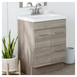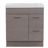- H cubby for additional easy-access storage space. Constructed of furniture board with a smooth laminate finish, this unique bathroom vanity features a transitional design with full-overlay slab doors, satin nickel hardware, and a midtone gray woodgrain appearance. This vanity set is completed by a 1-piece white cultured marble vanity top with an integrated rectangular sink. The single-sink vanity top is predrilled for a 4 in.