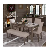 - Rustic rectangular wood tone dining table from a 6-piece farmhouse dining set. The table has a warm, natural finish and comfortably seats up to 6 people, making it a great fit for a kitchen or dining area. Sturdy and stylish, perfect for everyday use or hosting.