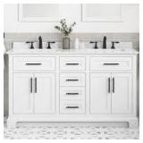(48). Home Decorators Collection Doveton 60 in. Double Sink Freestanding White Bath Vanity with White Engineered Marble Top (Assembled)