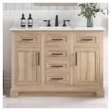 48 in W x 19 in D x 34 in H vanity with an engineered marble top Features 2-hardware sets, 5-soft-close drawers and 2-doors Includes top, backsplash and single sink; 8in faucet not included