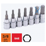 Contains 7 commonly used SAE hex bit driver sockets including 1/8, 5/32, 3/16, 7/32, 1/4, 5/16 and 3/8-inch. Constructed of chrome vanadium steel and heat treated for strength and durability. Color-coded storage rail indicates metric (red) sizes