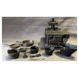 LOT#S & DESCRIPTIONS 1 Electrolux Frigidaire Top-Freezer Refrigerator, Stainless Steel Finish, 66 1/8 x 29 5/8 x 31 3/4? 5 Vintage Lionel Standard Gauge Train Kit, No. 384E with Cars No. 513, 512, 517, Transformer, Tracks and Accessories in Original Box 50 Gibson Freezer 51.5x28x37" 100 Dining Table with Laminate Top and 5 Chairs with Rattan Backs and Upholstered Seats, 34.5×67.5×29? 101 Majolica Dog with Kennel Plate, 11? 102 Marigold Carnival Glass Bowl with Ruffled Rim and Embossed Floral Design, 3×6? 103 Fenton Marigold Carnival Glass Ruffled Compote (chips on base) 5? 104 Jack in Pulpit Style Iridescent Carnival Glass Vase with Ruffled Rim, 9? 105 LE Smith Pink Depression Glass Vase with Intricate Pattern, 6? 106 Ruby Flash Glass Baskets with Etched Names, 5 1/2” Tall 107 Owl Salt and Pepper Shakers Marked Japan & Indiana-Themed Owl Dish 108 St. Clair Style Glass Paperweight With Encased Multicolored Floral Design, 2.5? 109 Greentown Caramel Slag Glass Cactus Vase with Scalloped Rim, 4 1/2” 110 Greentown Slag Glass Cactus Covered Candy Dish, 6? 111 Greentown Chocolate Slag Glass Pitcher with Embossed Cactus Design, 5? 112 Marigold Carnival Glass Bowl with Floral and Feather Design, 9? (chipped on the base) 113 Fenton Style Carnival Glass Bowl with Embossed Floral Pattern and Scalloped Edge, 8? 114 Northwood Tree Trunk Marigold to Clear Carnival Glass Swung Vase, 7 1/2” Tall 115 Metal Counter Bell with Relief Patterned Base, 3.25? 116 Westmoreland Milk Glass Hen on Nest Covered Dish, 2.5” 117 2 Butter Pat Molds with Carved Floral and Fruit Designs, 2-3? 118 Greentown Style Chocolate Slag Glass Butter Dish with Domed Lid and Scalloped Base, 6×5? 119 Rabbit with Cabbage Leaf Planter, Made in Japan, 4×5? 120 Marigold Carnival Glass Bowl with Scalloped Rim, 9” Diameter 121 Marigold Carnival Glass Windmill Ruffled Edge Bowl, 8? (small chip on base) 122 Fenton Marigold Carnival Glass Compote with Ruffled Rim, 4 3/4? 123 Iridescent Carnival Glass Bowl with Scalloped Rim, 6 1/2? Diameter 124 2 Green Enamel Bowls With Rimmed Edges, 11? 125 3 Brookpark Confetti Melamine Mixing Bowls, 7”, 8”, and 10” 126 Queen Cast Iron Miniature Stove with Accessories, 4×5 127 Wagner Ware Cast Iron Skillet, 9”, Model 1056T 128 Wilton Old Bullet Model Ladle with Tripod Base and Pouring Spout 129 Wagner Ware Sidney -O- No. 3 Cast Iron Skillet, 6 1/2” Diameter 130 Texas Ware Melamine Resin Bowl by Plastics Manufacturing Co., 11? 131 Pyrex 502 1.5 Pt. Brown Refrigerator Dish with Lid 132 Brookpark Melamine Mixing Bowl, 11 1/2” Diameter 133 Texas Ware Plastic Bowl with Multicolor Speckled Pattern, 11? 134 Cast Iron Skillet with Handle, 5” Diameter 135 4 Black and White Speckled Enamelware Plates, 8 1/2” Diameter 136 Pyrex 023 1-1/2 Qt. Opal White Casserole Dish with Clear Glass Lid (chipped on the rim) 137 2 Corning Ware Casserole Dishes with Lids, Spice of Life and Cornflower Designs 138 12-Piece Stainless Steel Place Setting with Regent Sheffield Knives 139 Hamilton Beach Electric Can Opener and Cutting Boards 140 Pyrex Old Orchard Glass Dish with Lid, 1.5 Qt 141 2 Pyrex Amish Butterprint Refrigerator Dishes with Lids (one lid is chipped) 142 RS Germany Hand Painted Porcelain Bowl with Floral Design, 10 1/2” 143 Pyrex 1-Quart Measuring Cup and Fire-King 1-Cup Measuring Cup (some chipping) 144 2 Measuring Cups: Pyrex Glass 16 oz & Fire-King Glass 16 oz 145 Corning Ware A-2-B 2-Liter Casserole Dish with Amber Lid, ‘Forever Yours’ Pattern 146 Corning Ware 1 Quart And 3 Quart Blue Cornflower Casserole Dishes With Glass Lids 147 Corning Ware Blue Cornflower P-4-B and Pyroceram A-84 Baking Dishes with Lids 148 Porcelain Figurines, Glass Oil Lamps, Decorative Plates, and Vases 149 Ucagco China Tea and Tableware Featuring Floral Motifs, Made in Occupied Japan 150 Tableware and Decorative Items Inc. Teapots, Plates, Creamer and Shakers 151 Mouse and Owl Figurines from Napcoware, Enesco, and Brinn’s 152 Figurines, Glassware, and Shell Collection 153 Figurines and Collectibles Featuring Animal Motifs 154 Animal Figurines In.c Marked Japan, Plush Mice & Amber Glass Pedestal Vase 155 Farberware Nonstick Cookware, Glass Leaf Dish, and Decorative Serving Plates 156 Tableware Inc. Serving Platter, Covered Candy Dishes, Decanter, Fish Shaped Blue Glass Bottles, Glass Basket & More 157 Plastic Food Storage Containers with Lids 158 Stainless Steel Flatware with Assorted Kitchen Utensils 159 Cotton Kitchen Towels with Various Colors and Patterns 160 Cloth Kitchen Towels in Various Colors and Patterns 161 Kitchen Textiles With Floral and Geometric Patterns 162 Clips, Containers, and Household Items 163 Metal Baking Pans, Racks, and Trays 164 Dishes, Glassware, and Plastic Storage Containers 165 Drinking Glasses, Plastic Cups, and Storage Containers 166 Kitchen Utensils with Plastic and Metal Components 167 Metal and Plastic Kitchenware with Manual Grinders and Utensils 168 CorningWare Baking Dishes with Lids and Glass Accessories 169 Melmac, Dinnerware, Drinkware, and Ceramic Decorative Items 170 Glass Dessert Bowls, Plastic Containers with Lids, and Cups 171 Knives With Wood Handles And Matchbox Collection 172 Quilted Oven Mitts and Pot Holders 173 Kitchen and Utility Tools with Measuring Equipment and Flashlights 174 Kitchenware Including Bakeware, Food Storage, and Utensils 175 Sterilite 3-Drawer Plastic Storage Cabinet on Casters with Contents Inc. Hardware, Tools & Electrical Components, 15.5×12.5×26.5? 176 Metal Rolling Cart with Live Spider Plant and Artificial Plant, 22x16x30? 177 Glass Vases, Jars, and Figurines with Decorative Accents 178 Plastic Storage Containers and 5 Advertising Rulers Featuring Dean Colter, Inc. Lawn & garden Equipment, Feller Funeral Home, Millers Merry Manor & Hook’s 179 Stainless Steel and Aluminum Cookware by Farberware and Revere Ware 180 Sharp Countertop Microwave Oven with Digital Control Panel 181 4 Painted Cast Iron Amish Family Figures, 3-5? 182 Imp