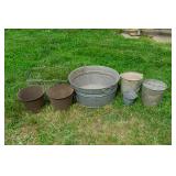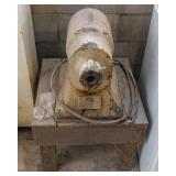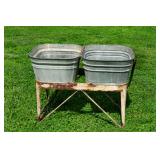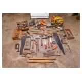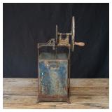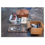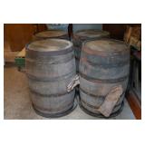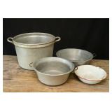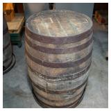 WINE MAKING & BUTCHERING Large Aluminum Military Kettle, Hobart 4332 Commercial Meat Grinder & Attachments, Two Vintage Wood Handle Meat Saws, Vintage Craftsman Meat Cleaver, Wood Cutting Block, Case XX CC 307-5 1/2" Butcher Knife, Aluminum Kettle, Pots and Graniteware Bowl, Sharpening Stones, Butchering Meat Saw, 1960's Cast Iron Bottle Capper, 1970 Stitzel-Weller Distillery Bourbon Barrel & Four Vintage Bourbon Barrels.