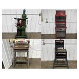 = Good Condition, Keys Included = Adjustable Height For The Pans = Casters For Easy Movement Around The Shop = 22.25” L x 21.75” W & An Adjustable Height