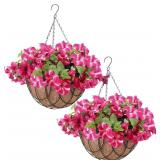 2 Pack Artificial Hanging Flowers in Basket for Spring Summer Outdoor Decor Fake Hanging Plant Faux Petunias Flower with 12 inch Coconut Lining Basket for Patio Garden Porch Home (Fuchsia)