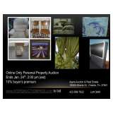 Personal Property online only auction. Bidding begins Jan. 10th, ends Jan. 24th at 2:00 pm (est). Rugs, drapes, tables, recliner, leather sofa, bar, bar stools, headboards, chairs, ottomans, and much more. |