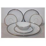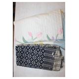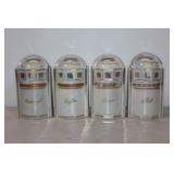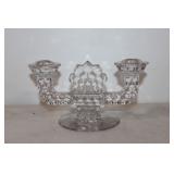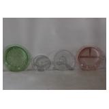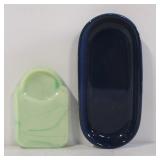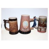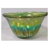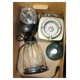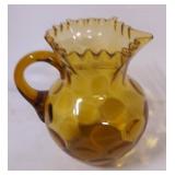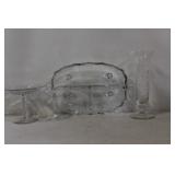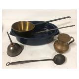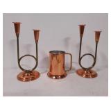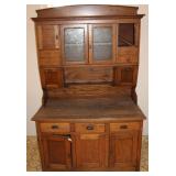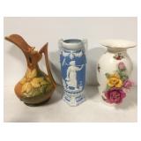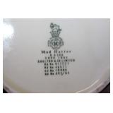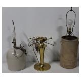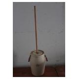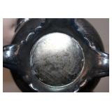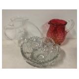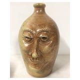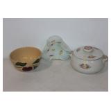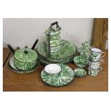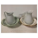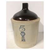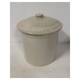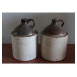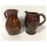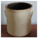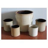 Glassware, Pottery, & Crocks: Large crock w/ handle #5 Blue Ribbon, sm. brown crock jug w/ handle, Crock with lid #4 (sm. Chips), Copper mug, copper candlesticks, 3 sm. pcs. of pottery, glass jug w/ handle, colorful glass bowl, Lg. cast Iron & porcelain bowl, Poppytrail By Metlox china set incl. cups, plates, dishes, butter dish, etc., Crystal punch bowl and cups set, 2 pitchers w/ wash bowls, incl. Thomas Fernival & Ironstone china, Roseville vase, B.R. Van Benschoten Face jug crock, misc. pitchers, etc.