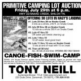 PRIMITIVE CAMPING LOT AUCTION FRIDAY EVENING JULY 29 AT 6PM HWY 22/SNAKE CREEK, SHILOH TN. OFFERING 38 LOTS IN HAGYS LANDING Want to bid and cannot come to auction call TONY at 731-926-3133 to register to bid by phone!!!! #1. lots 23 thru 28 on Snake Creek #2. lots 29 thru 38 on Snake Creek #3. Lots 47 thru 53 #4. Lots 1 thru 10 # 5. Lots 11 thru 15 one on Snake Creek # 6.Then all 38 lots! Canoe-Fish-Swim-Camp TERMS: 10% Buyers Premium applies. Owner Financing available. Agents on grounds with maps Saturday Eve. July 23 from 5 to 6 or anytime by appointment. call 731-926-3133 visit www.tonyneill.com and see on face book at TONY NEILL. On line bidding starts Tuesday July 26! TONY NEILL, auctioneer/broker TFL 1468 225 Dude Dr. Savannah Tenn. 38372 www.tonyneill.com 731-926-3133 tneillauction@gmail.com |