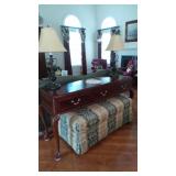 FURNITURE: · Gorgeous Flame Mahogany with Leather Seat Hall Tree · Lake Hickory Collection Upholstered Sofa · Pair of Jessica Charles Merlot Colored Upholstered Arm Chairs · Fantastic Cream Colored, Hand Painted Cupboard · Lovely Cherry Console/Sofa Table · Oversized Upholstered Ottoman · Fabulous Hand Painted Bar/Counter Stools · Ethan Allen Cabinets · Thomasville Side Table · Gorgeous Key City Camel Back Sofa · Wrought Iron and Glass Top Oval Coffee Table · Super Pretty Antique Drop Front Mahogany Secretary · Nice Upholstered Slipper Chair · Beautiful Cream Upholstered Taylor King Wing Back Arm Chair · Chinese Chippendale Style Corner Carved Chair · Metal File Cabinet · Pretty 5-Shelf Mahogany Hanging Plate Rack · Upholstered Sleeper Sofa · Lovely Upholstered Office Chair · Cream/Off White Scroll Arms Upholstered Bench · Pattern Upholstery Bed Bench · 2-Tier Plant Stand/Side Table · Cute Small 4-Drawer Chest of Drawers · Leather Ottoman