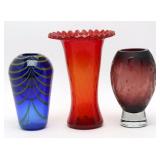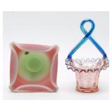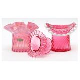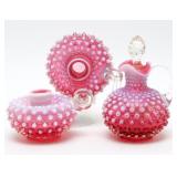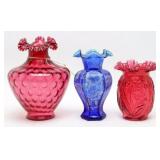 - FENTON ART GLASS including Cranberry opalescent hat, Hobnail cranberry opalescent candlesticks and cruet, Celebration cobalt vase, baskets including cranberry opalescent, Coin Dot cranberry vase, Lotus Mist bowl, etc.