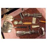 Vintage Sold Metal Shoe Horn - Dr. Scholl's, foot comfort appliances and remedies - make happy feet; Two hand mixtures - Flint and Maynard; an vintage Ice cream - made by Hamilton Beach; and Two flippers. |