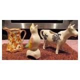 Cash Family Hand Painted Ewin, TEN. - Renfro Valley - Browns Oranges - Creamer - No chips, nicks, cracks or crazing - 4"H x 3-3/8"L x 3"W; Souvenir of Buckeye Lake - Cow Creamer - No chips, nicks, cracks or crazing - 4-7/8"H x 7-1/4"L x 2-1/4"W; Pie Bird - 5"H x 2-1/4"L x 1-3/4"W - No chips, nicks or crazing - does have two age cracks - see photo. |