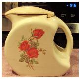 Universal Cambridge -Oven Proof - Made in U.S.A. Warranted 22 Carat Gold - Refrigerator Water Pitcher with Lid (Finding the matching Lid is RARE) - Does have some nicks on the inside rim and one nick on the lid - and the lid does look like it should have been longer - a flat break across the back end of the lid - unit does have crazing - the Gold does show wear also. Still a very nice find - 7"H x 7-1/4"L x 4-1/4"W. |