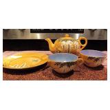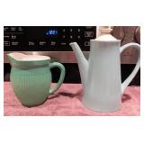 One Large Green Ribbed Creamer - Unmarked - 5"H x 5-3/8"L From spout to handle x 3-5/8"W - No Chips or nicks - No Crazing - No Cracks - Green coating shows wear; Light Blue Tea Pot with White Lid - Has USA on the bottom - Spout has NO DAMAGE - Lid has NO DAMAGE - Bottom does show an age crack - 7-1/2"H including the lid x 7"L from spout to handle x 4"W (4"Dia at the base). |