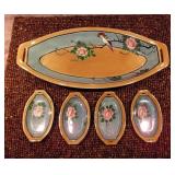Made In Japan - Serving dish with four matching sauce dipping dishes. Serving dish is 1-1/2"H x 11-1/2"L x 5-3/8"W - Some ware on the handles - NO Chips, Nicks, Cracks or Crazing. The other Four - 3/4"H x 3-3/4"L x 2-1/4"W - NO Chips, Nicks, Cracks or Crazing - some wear on the paint portion. |