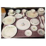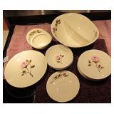 Here are a group of dishes that match - but there is something wrong with all of them - either chip, nick, crack or crazing - you have one sugar bowl no lid - one lunch plate - three smaller bowls - five bread and butter plates - one saucer - and one of the large double divided serving bowls - Universal Potteries Inc - Alpine - Fascination. |