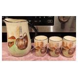 Vintage Porcelain Juice Pitcher With 3 Cups. Pitcher has NO DAMAGE on it - 6-1/2"H x 6-1/4"L from spout to handle x 4-1/4"Dia; The cups - has NO Chips, Nicks or Cracks - does show crazing on the bottom and inside looks like it might have crazing - Outside does not - 3-1/2"H x 2-3/8"Dia - One of the cups does have a manufacture Flaw on the side. |